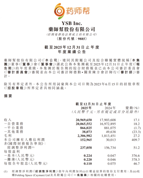 财报夸耀,药师帮2025年扫尾交易收入209.7亿元,同比增长17.13%;集团领有东谈主应占年内利润为东谈主民币1.53亿元,同比增长409.66%,盈利材干权贵增强。