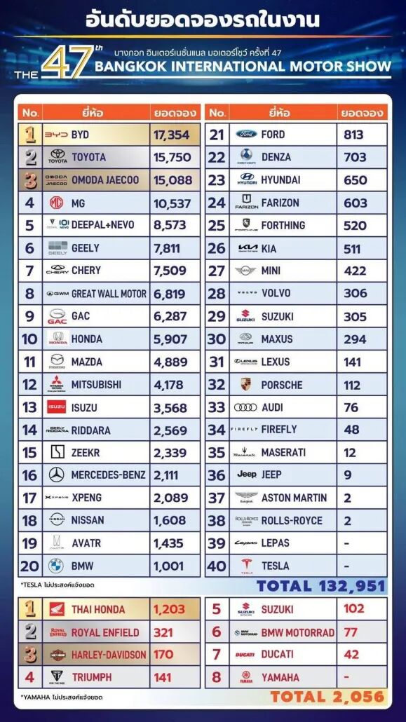 曼谷车展销量排名(数据起头:曼谷车展主理机构Grand Prix International Public Company Limited)