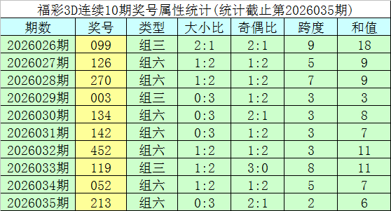 开奖回顾:福彩3D第2026035期奖号为213。奖号形态为组六,大小形态为小小小,奇偶形态为偶奇奇,和值为6,跨度为2。