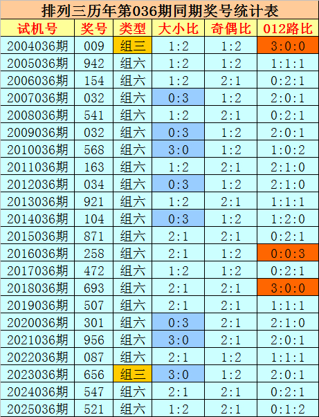 012路分析:历史上排列三第036期同期奖号中,012路奖号总个数比为26:20:20,012路奖号轮空期数比为7:8:6,今年第036期预计2路号码走冷轮空,看好012路比开出2:1:0。