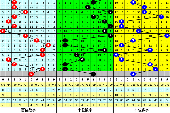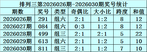 跨度分析:最近5期分别开出跨度:2、7、3、5、6,本期注意跨度走小,参考跨度3。