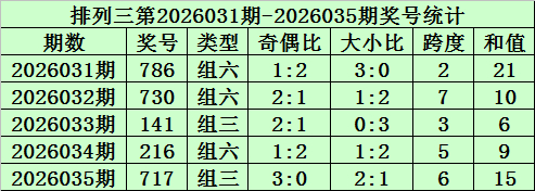 上期回顾:排列三第2026035期开奖号码为717。奖号类型为组三,奇偶比为3:0,大小比为2:1,跨度为6,和值为15。