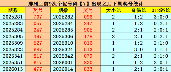 个位前9次开出号码7时,该位下期奖号分别为:6-7-5-8-6-3-9-0-3,其中号码个数012路比是6:1:2,奇偶比是5:4,大小比是6:3。