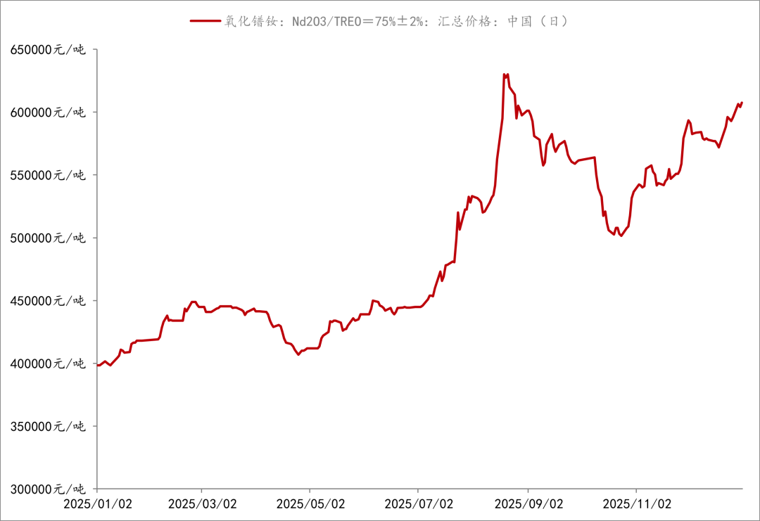 2025年,主要轻稀土产品价格有所上涨,但部分中重稀土产品价格仍呈下行态势。上海钢联数据显示,2025年12月31日国内氧化镨钕价格报60.75万元/吨,相较于2025年年初上涨52.45%。中重稀土方面,2025年下半年氧化镝价格降幅达16.7%,进入四季度后下跌速率加快。2025年氧化铽价格则呈现先上升后下降的走势,下半年价格降幅达15.8%。