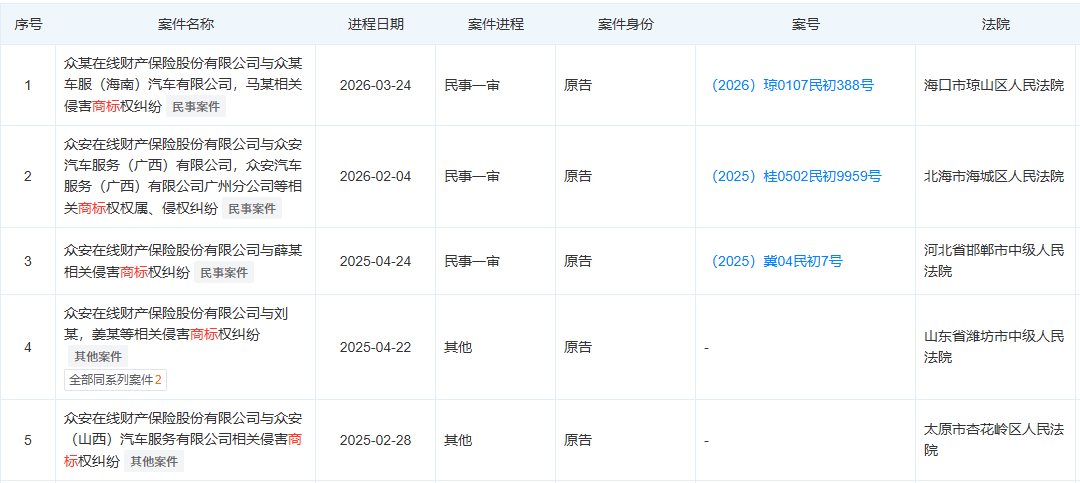 早在2025年初,一场全国性的“打假”行动就已悄然展开。公开信息显示,山东、山西、河北、海南等多个省份,涌现出一批名称中带有“众安车服”、“众安车保”字样的公司。天眼查信息显示,案件状态多为“审理中”,一场遍布全国的法律交锋已然开场。