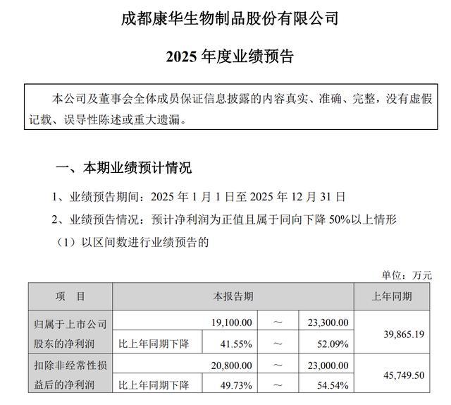 1月23日,康华生物发布了2025年业绩预告,预告显示,预计2025年公司实现净利润1.91亿元至2.33亿元,同比下滑41.55%至52.09%,上年同期盈利3.986亿元;实现扣非净利润为2.08亿元至2.3亿元,同比下滑49.73%至54.54%。