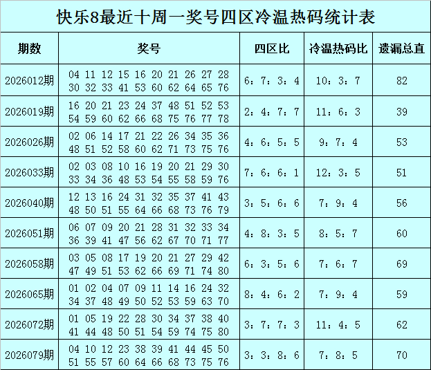 福彩欢畅8第2026079期(上周一)开奖回归:04 10 12 23 38 39 41 44 45 50 51 55 57 60 64 66 68 73 75 76,其中奖号四区比为3:3:8:6,冷温热码比为5:8:7。