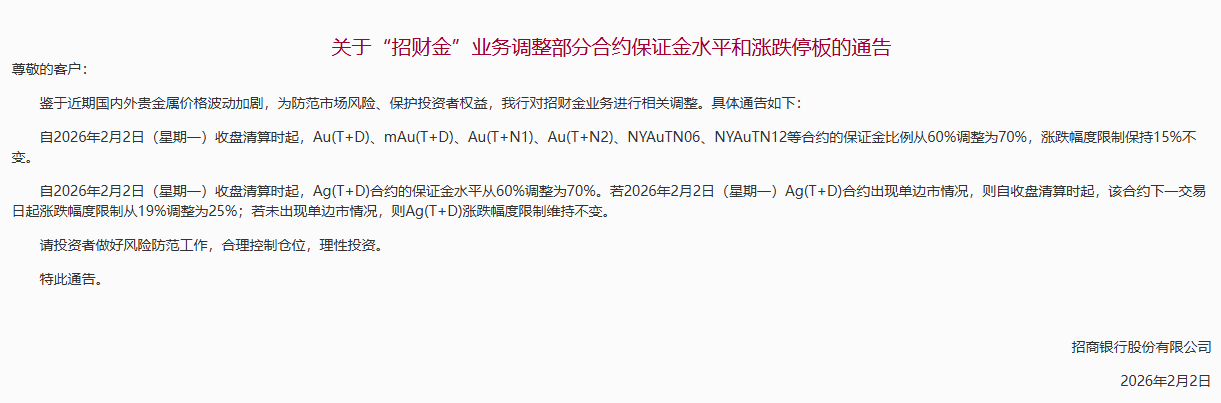 招商银行称,鉴于近期国内外贵金属价格波动加剧,为防范市场风险、保护投资者权益,我行对招财金业务进行相关调整。具体通告如下:
