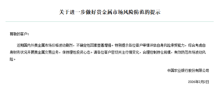 中国农业银行发布关于进一步做好贵金属市场风险防范的提示、中国邮政储蓄银行关于做好贵金属价格波动风险防范的提示。