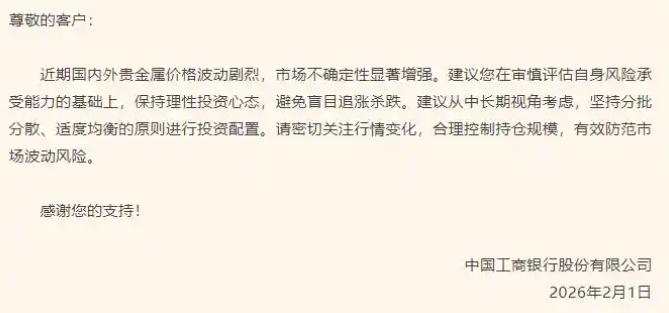 2月1日,工商银行发布风险提示称,近期国内外贵金属价格波动剧烈,市场不确定性显著增强。建议投资者在审慎评估自身风险承受能力的基础上,保持理性投资心态,避免盲目追涨杀跌。建议从中长期视角考虑,坚持分批分散、适度均衡的原则进行投资配置。请投资者密切关注行情变化,合理控制持仓规模,有效防范市场波动风险。