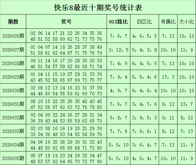 福彩快乐8第2026035期开奖回顾:05 07 18 19 23 24 29 32 34 47 48 53 57 62 64 65 70 72 77 80,其中奖号012路比为5:5:10,四区比为4:5:4:7,奇偶比为10:10,大小比为11:9。