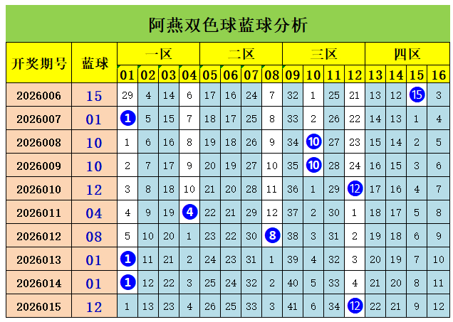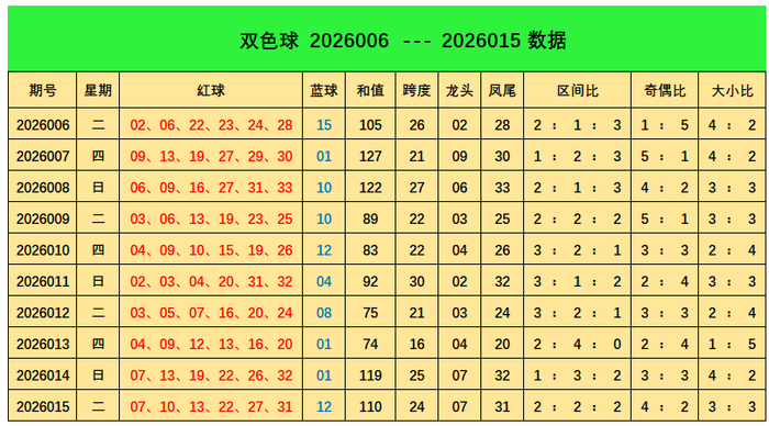 上期回顾:双色球第2026015期开出奖号:红球07、10、13、22、27、31;蓝球12,其中红球三区比为2:2:2,奇偶比4:2,大小比为3:3,蓝球开出0路号码12。