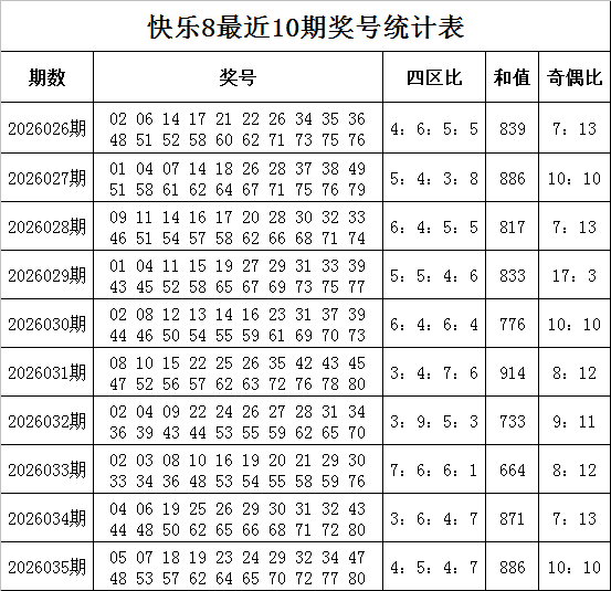 快乐8历史开奖至今已开出了1856期奖号了,上期奖号四区比为4:5:4:7,历史上四区比4:5:4:7共出现了13次。